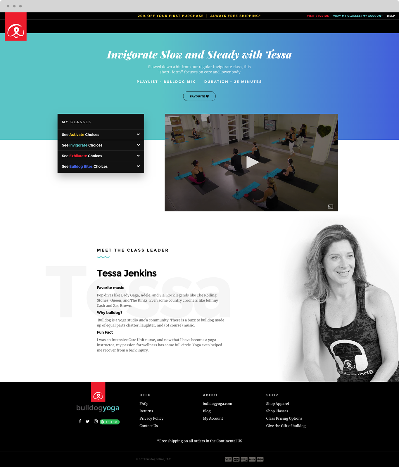 Bulldog online is a stand alone website from bulldogyoga.com. Comprised of a yoga class membership platform and apparel shop, the challenge was to effectively emphasize, enlighten and simplify the purchase flow of the online yoga membership feature while still making the apparel shop easily identifiable.
