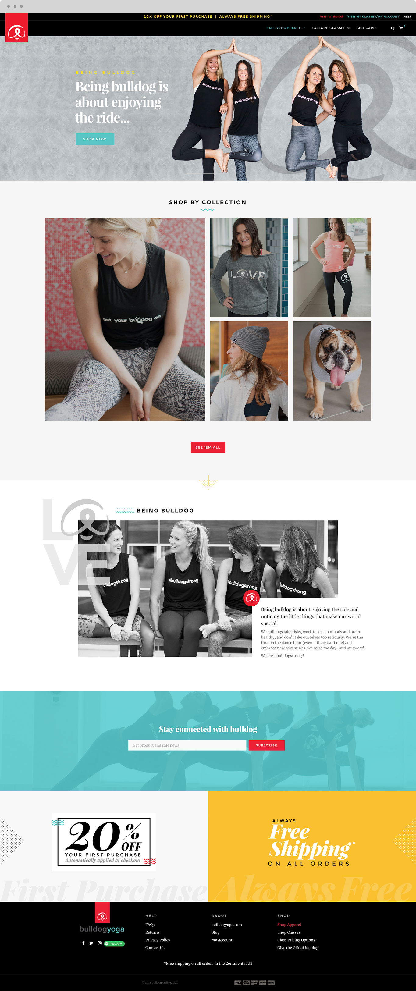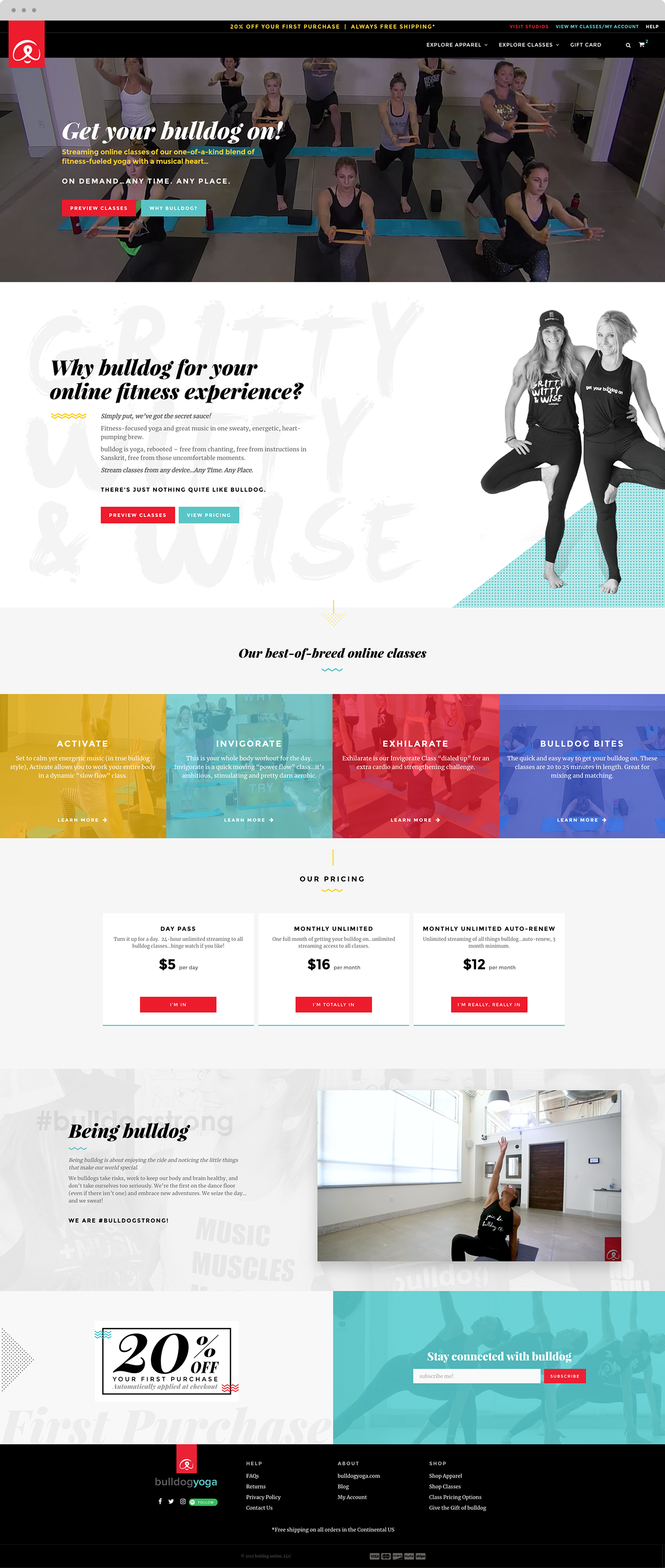 Bulldog online is a stand alone website from bulldogyoga.com. Comprised of a yoga class membership platform and apparel shop, the challenge was to effectively emphasize, enlighten and simplify the purchase flow of the online yoga membership feature while still making the apparel shop easily identifiable.